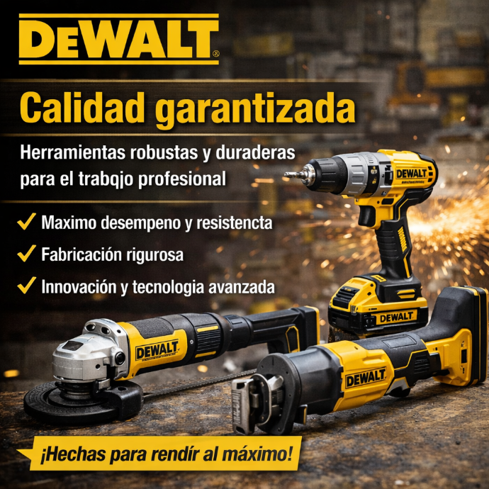 DEWALT Ofrecemos precios competitivos sin sacrificar calidad. Trabajamos para brindarte las mejores herramientas al mejor costo del mercado, asegurando una excelente relación precio–beneficio. Con nosotros obtienes productos confiables, promociones constantes y una inversión inteligente para tu trabajo.