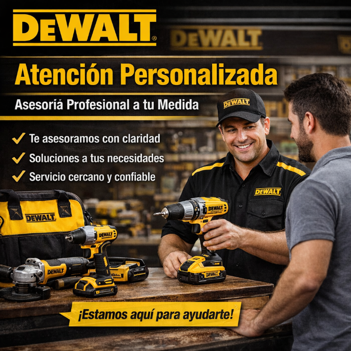 En DEWALT Brindamos atención personalizada para ayudarte a elegir la herramienta ideal según tus necesidades. Nuestro equipo está capacitado para asesorarte de forma clara y profesional, garantizando una experiencia de compra confiable y cercana. Nos enfocamos en ofrecer soluciones prácticas y un servicio de calidad en cada atención.
